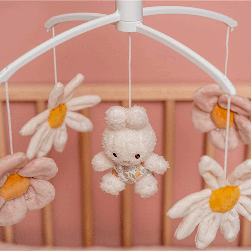 Por ejemplo, el Móvil Musical Miffy Vintage Flores Little Dutch combina movimiento y música suave, ayudando a relajar al bebé y estimular su atención visual.
